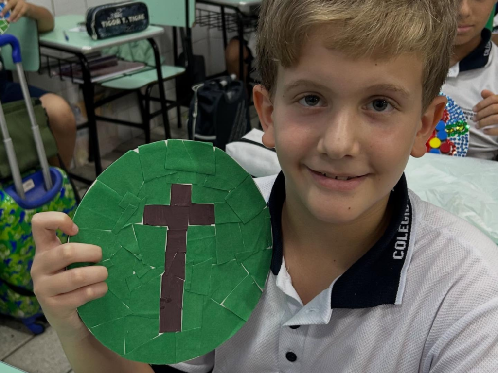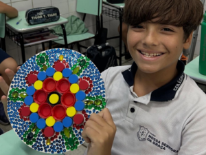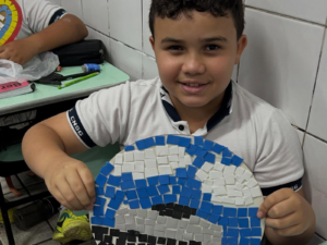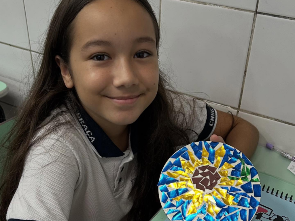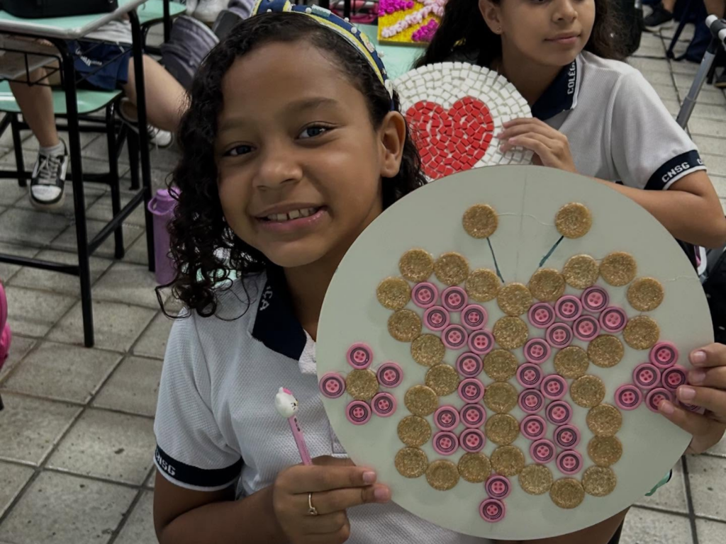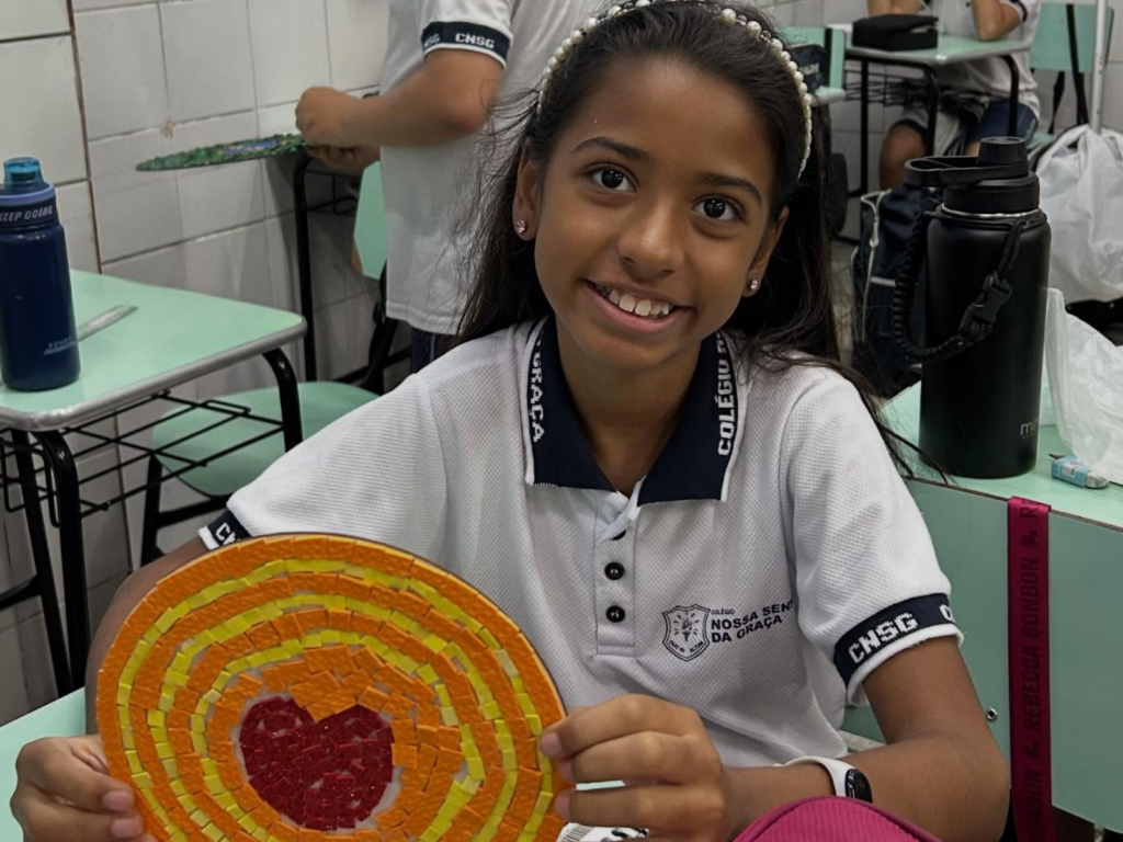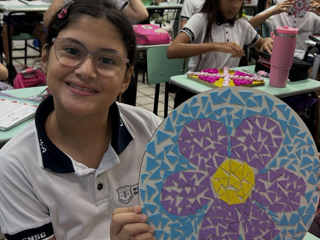 Os estudantes do 5º ano do Colégio Nossa Senhora da Graça participaram de uma atividade que uniu matemática e expressão artística por meio da criação de mosaicos. A proposta possibilitou a exploração de conceitos matemáticos de maneira dinâmica, utilizando figuras geométricas para a construção de composições visuais.
